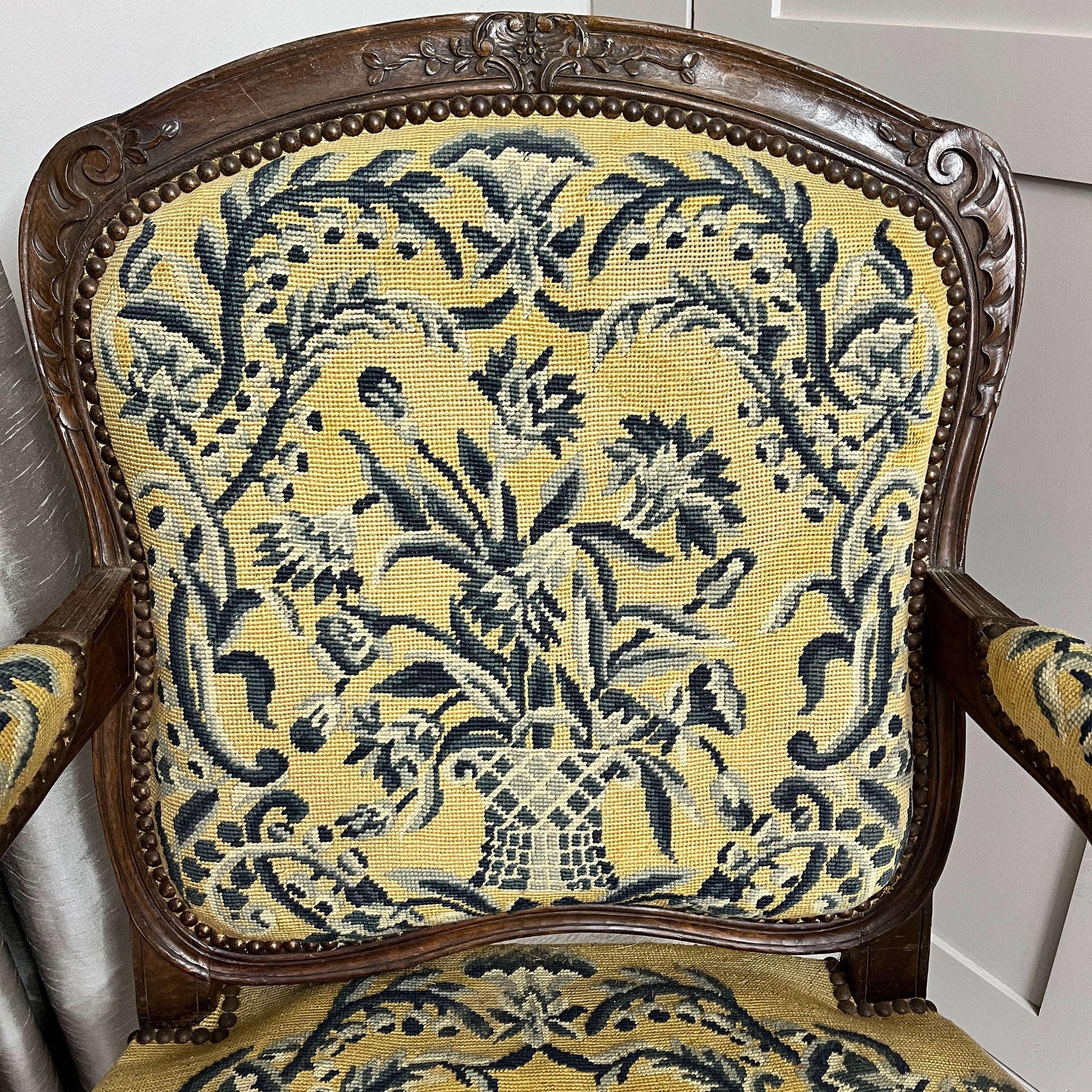 This is a really stunning antique French chair which has its original yellow and blue tapestry cover. It has a very decorative frame with carved shaped legs and floral detail on the top of the frame.