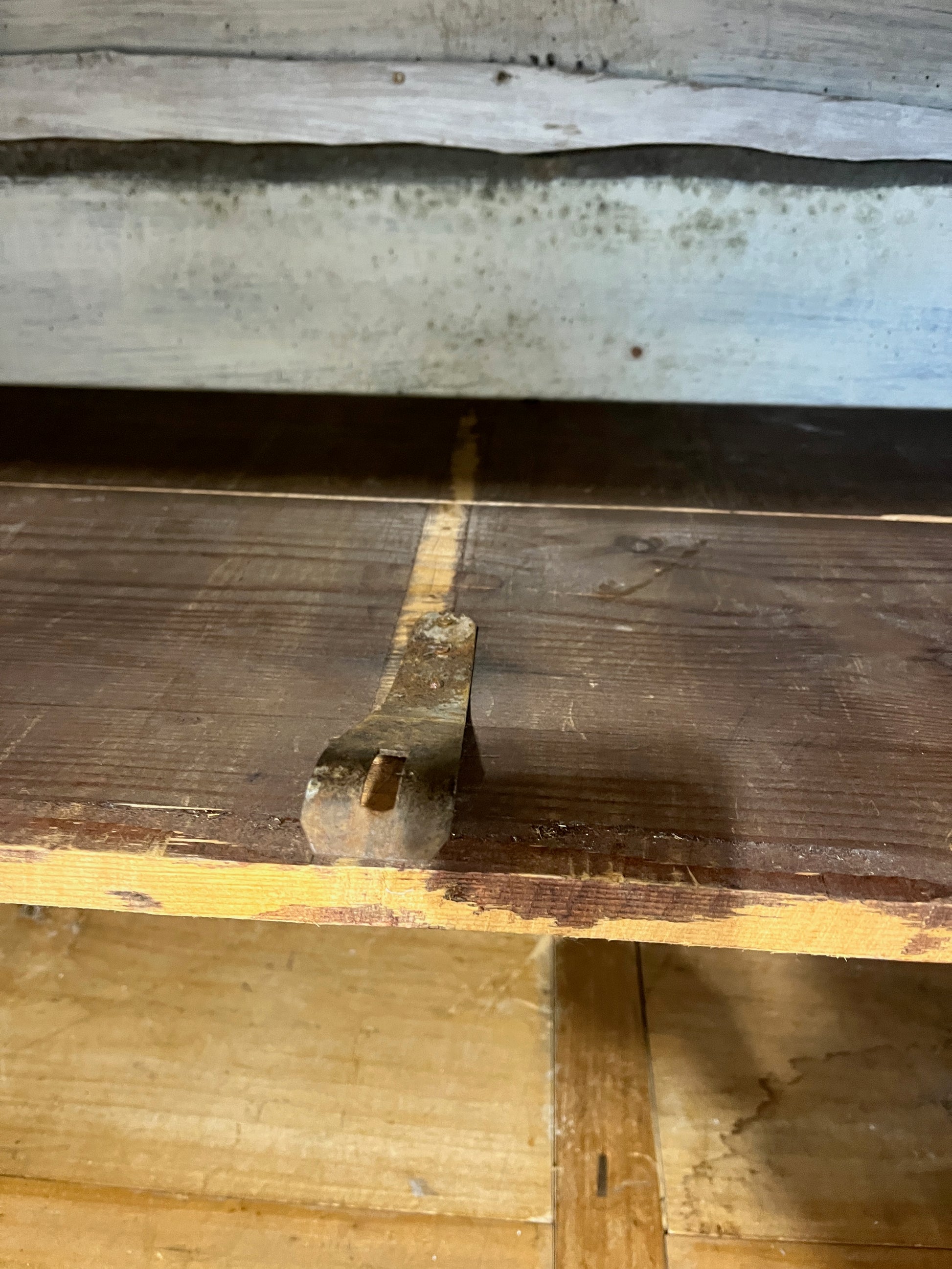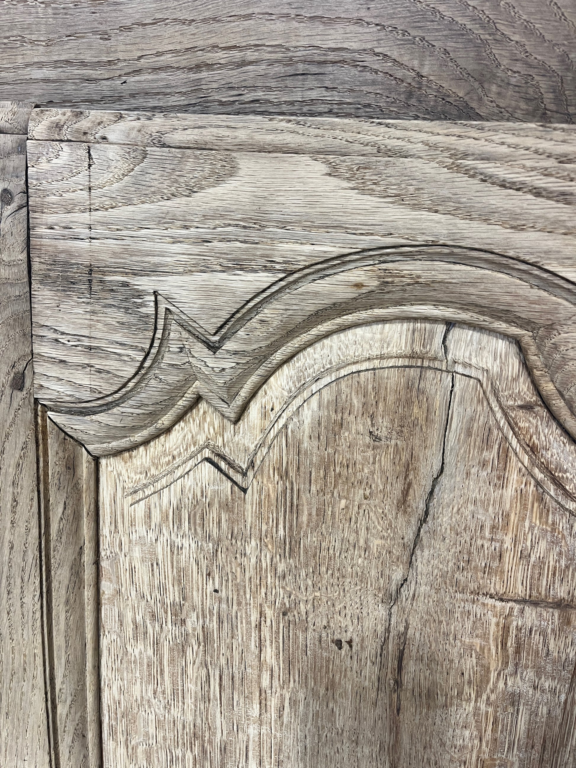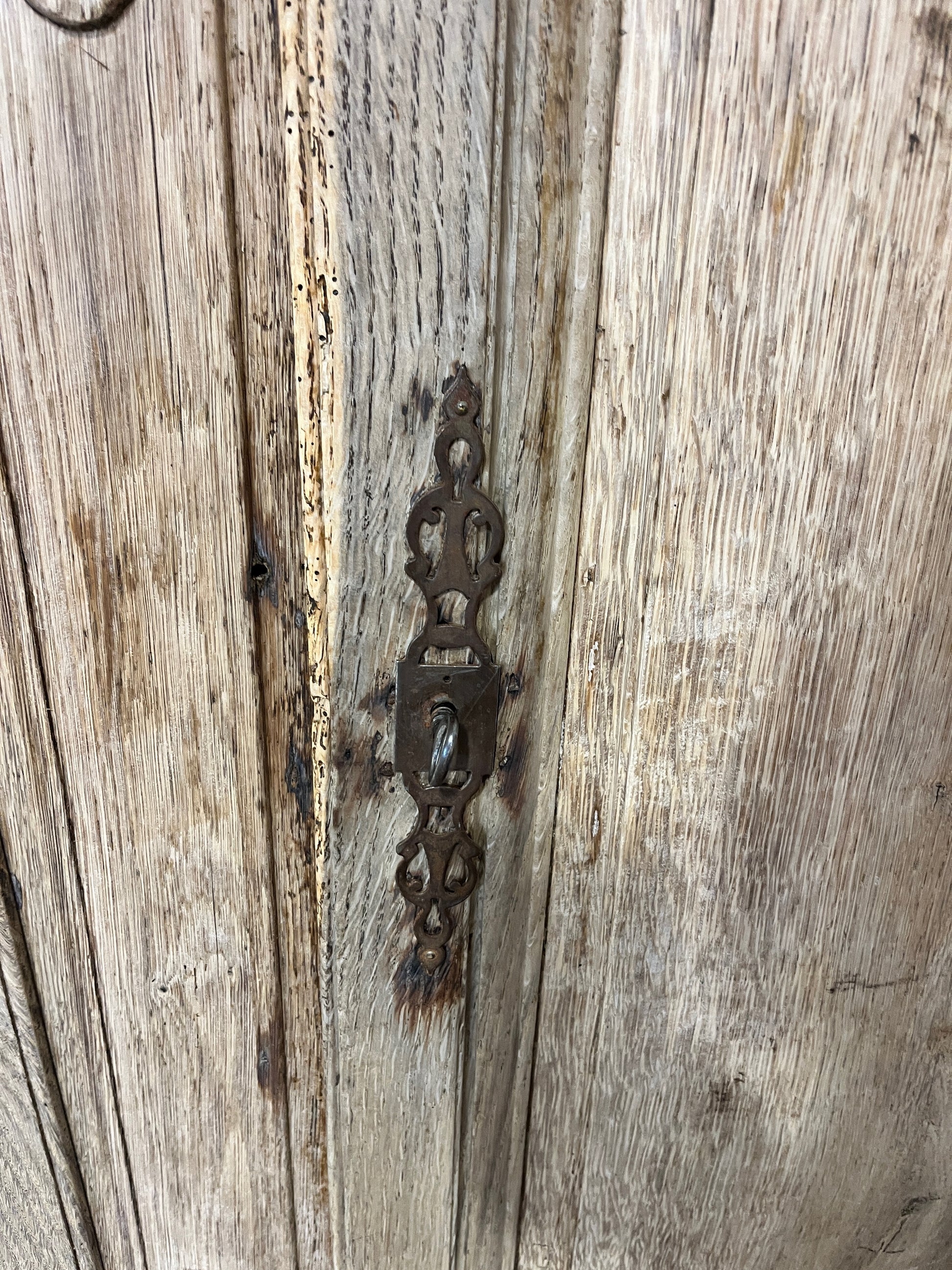 This is a beautiful (and very old) antique wooden cupboard, believed to be French in origin. It has two decorative doors, a shelf inside and a latch (but there is no corresponding latch on the door). It is closed using a lock and key. It stands on tall legs and has a decorative wavy edge at the bottom of the piece around the front and sides