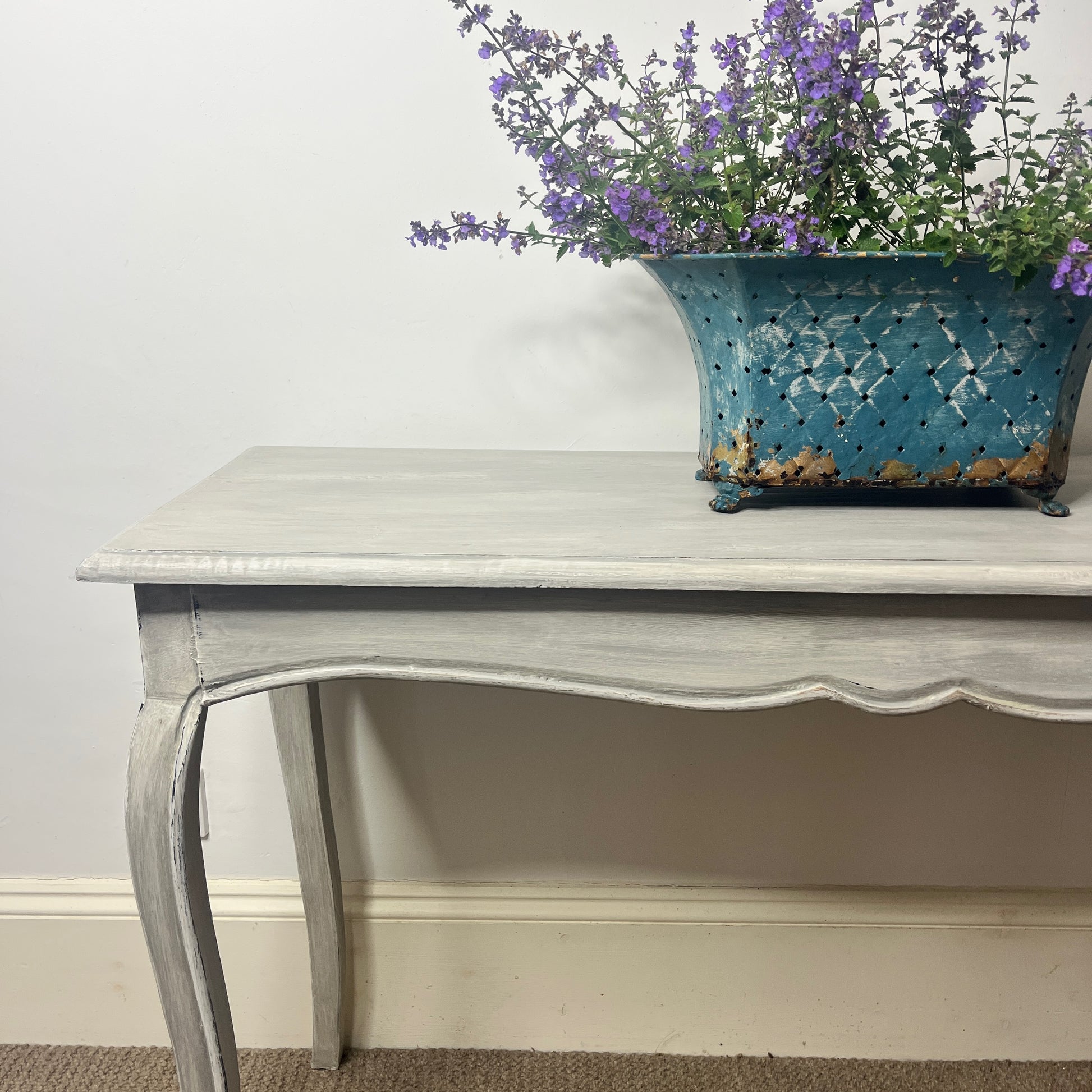 This vintage console table has been painted in Annie Sloan Pure, then white washed in a soft grey and waxed.