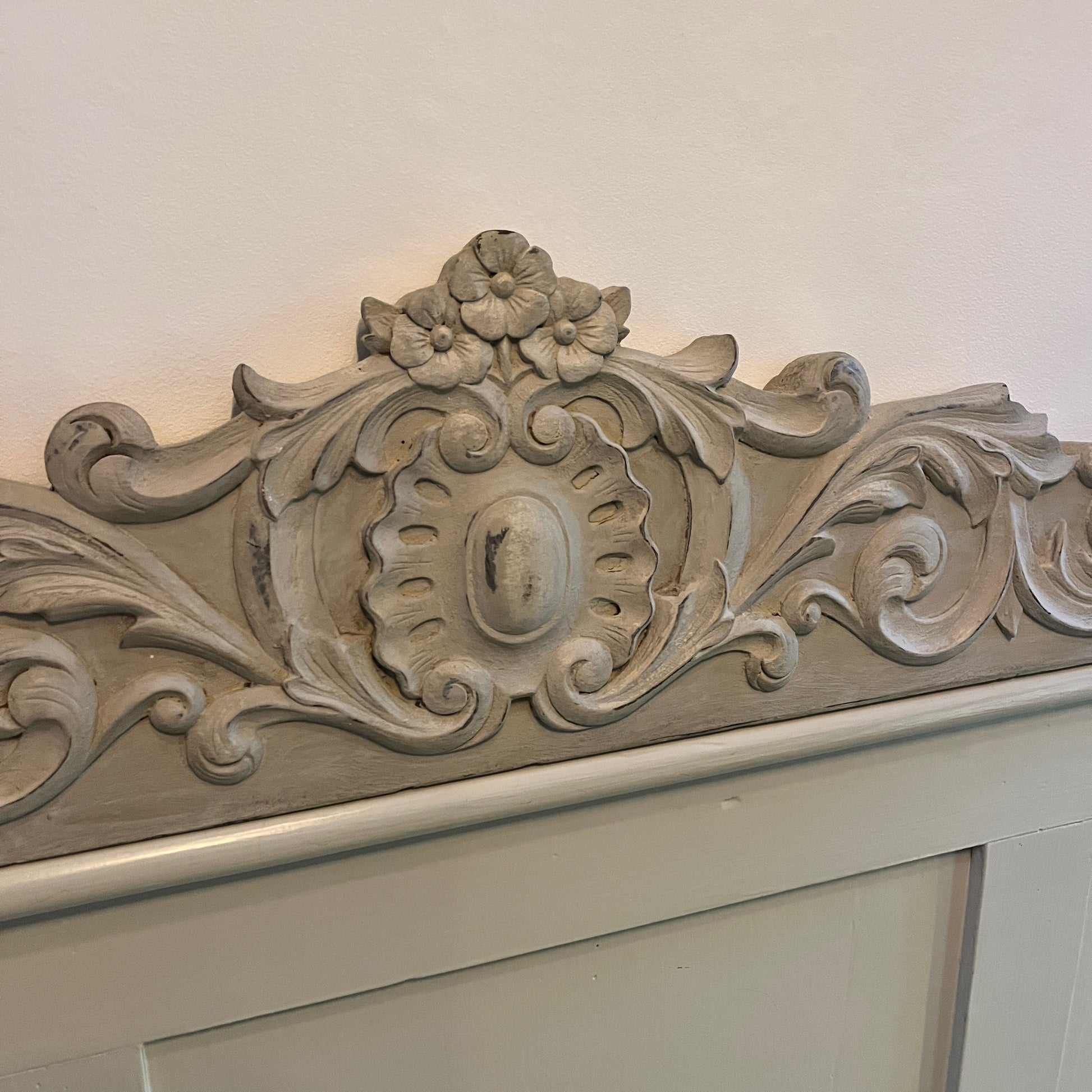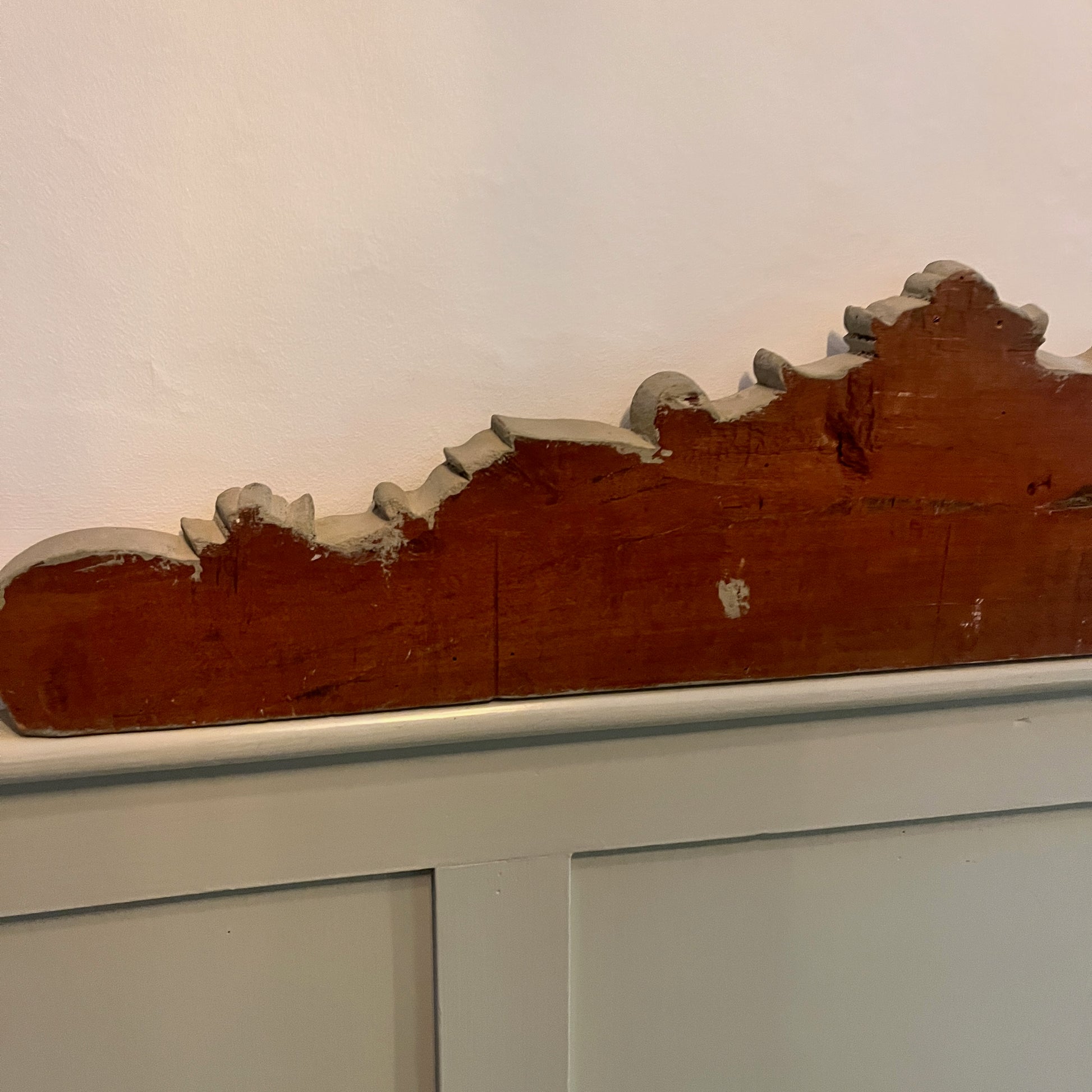 This decorative pediment is designed to go above a door. It has scroll detail throughout and is made from wood.