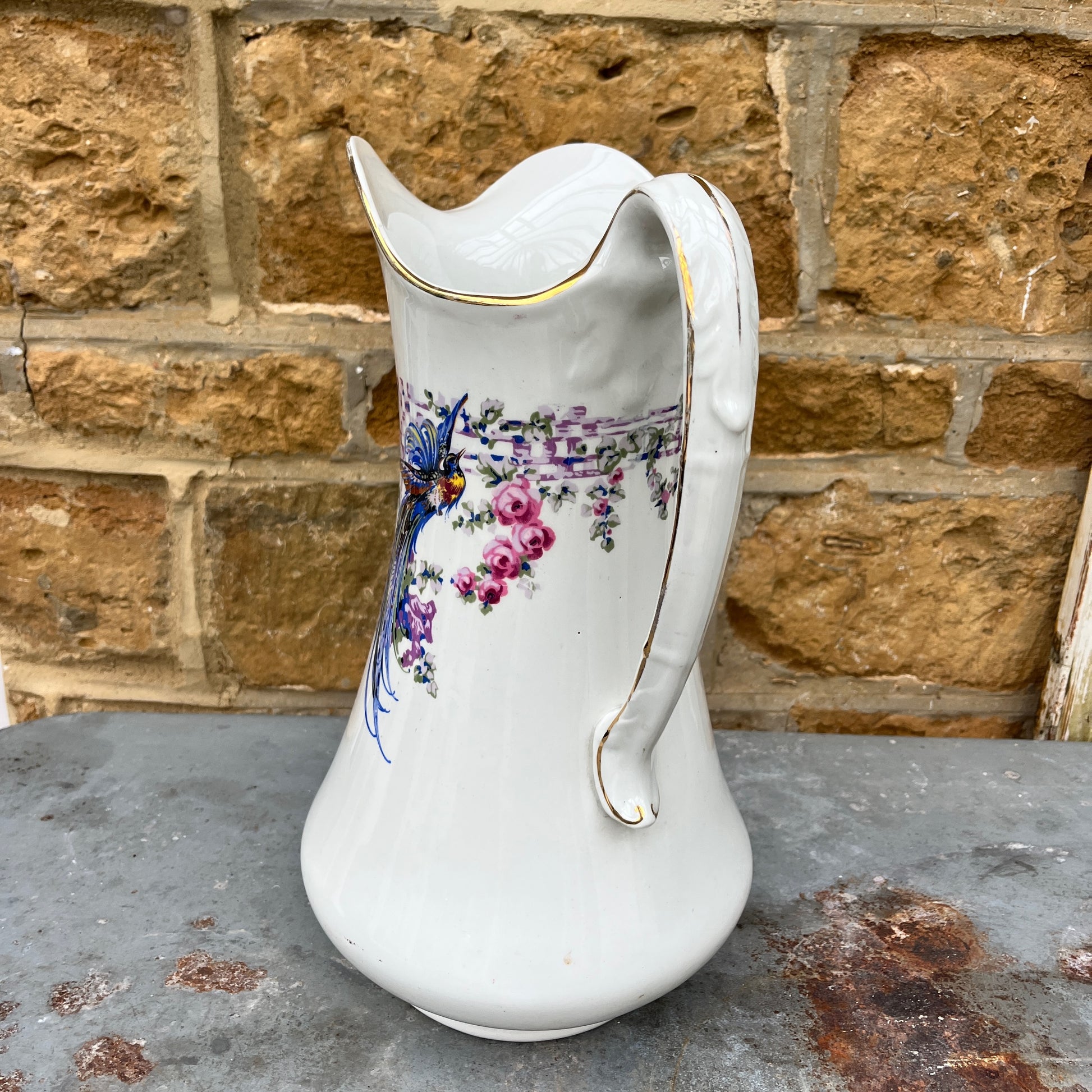 This large vintage ceramic jug has gold coloured edging around the rim and down the handle. It has a large decorative bird on both sides of the jug (I think its a bird of paradise) against flowers and a large attractive spout. It was made in England by Newport Pottery Co Ltd in Burslem
