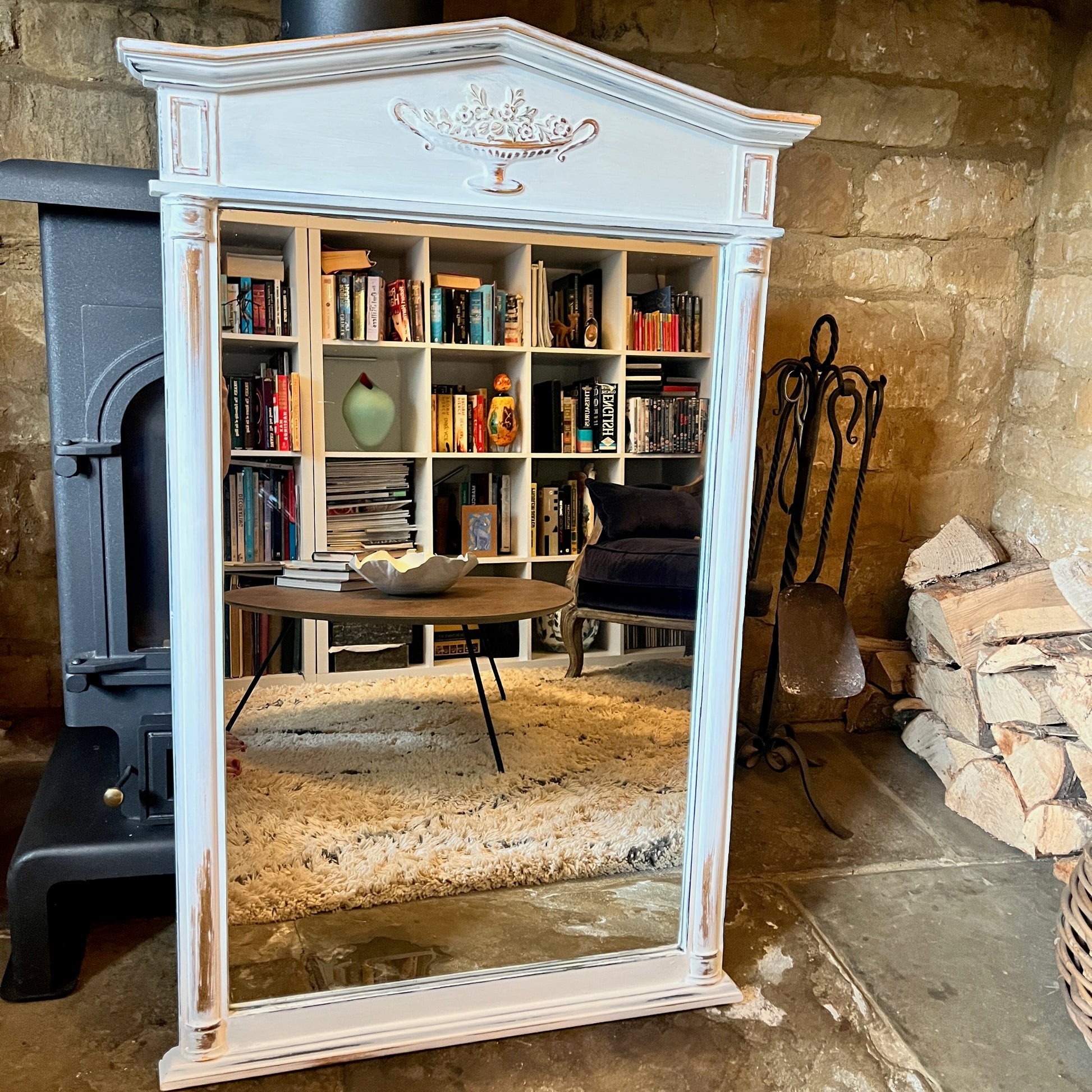 This lovely vintage Belgium mirror has been painted white and then distressed to allow the gold and grey areas originally on the mirror to come through. It has an urn carved into the wood at the top of the mirror and pillars down either side.