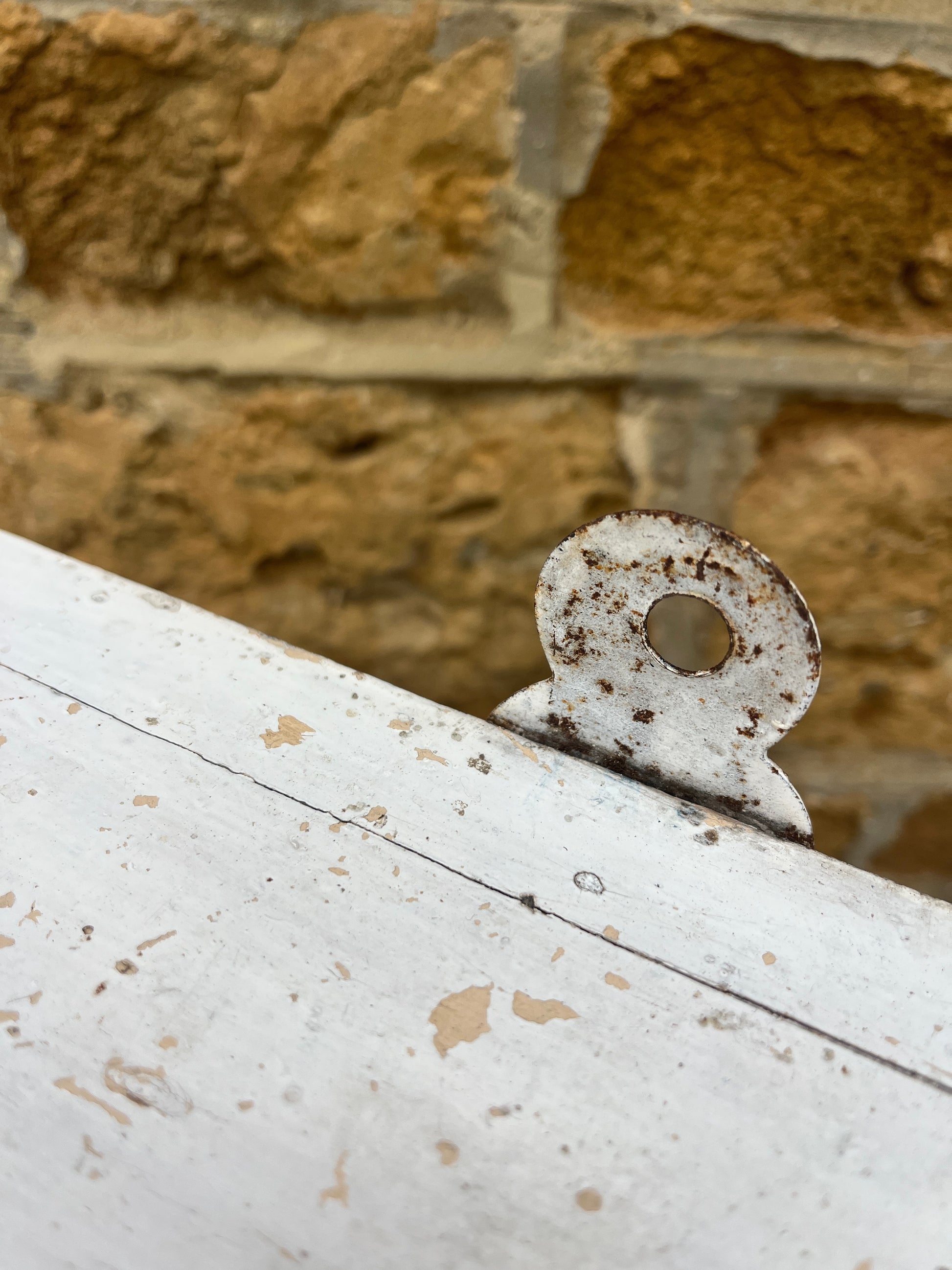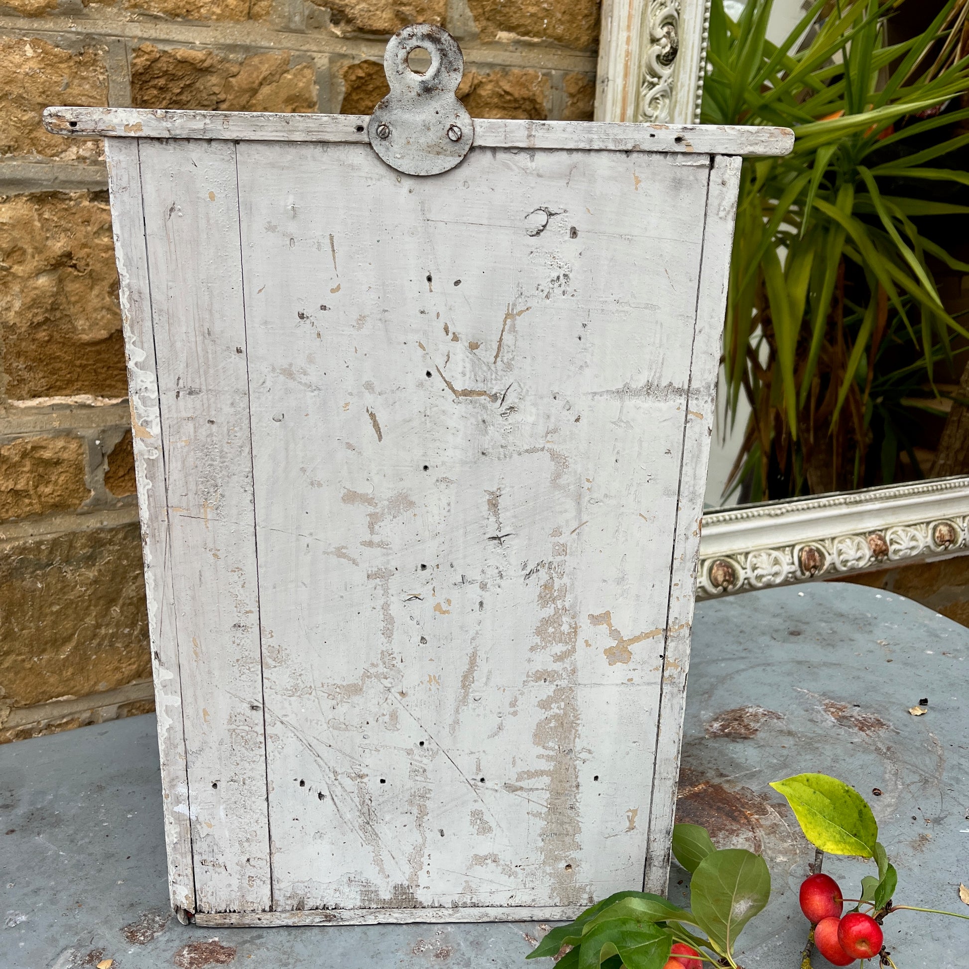 This is a really lovely vintage cupboard. It has a decorative front door which has been worn over the years showing the cream paint under; which has a key and a twist fastening.