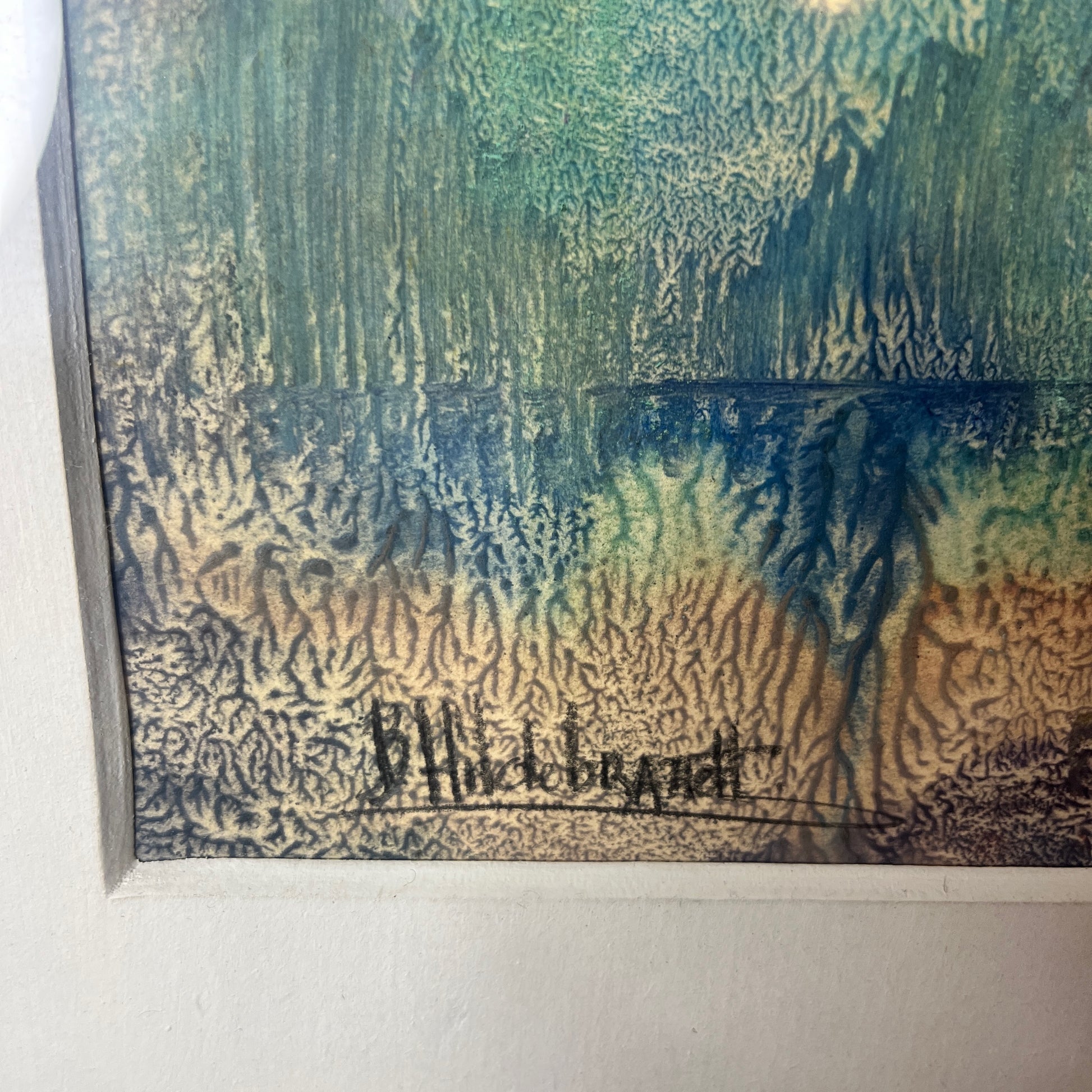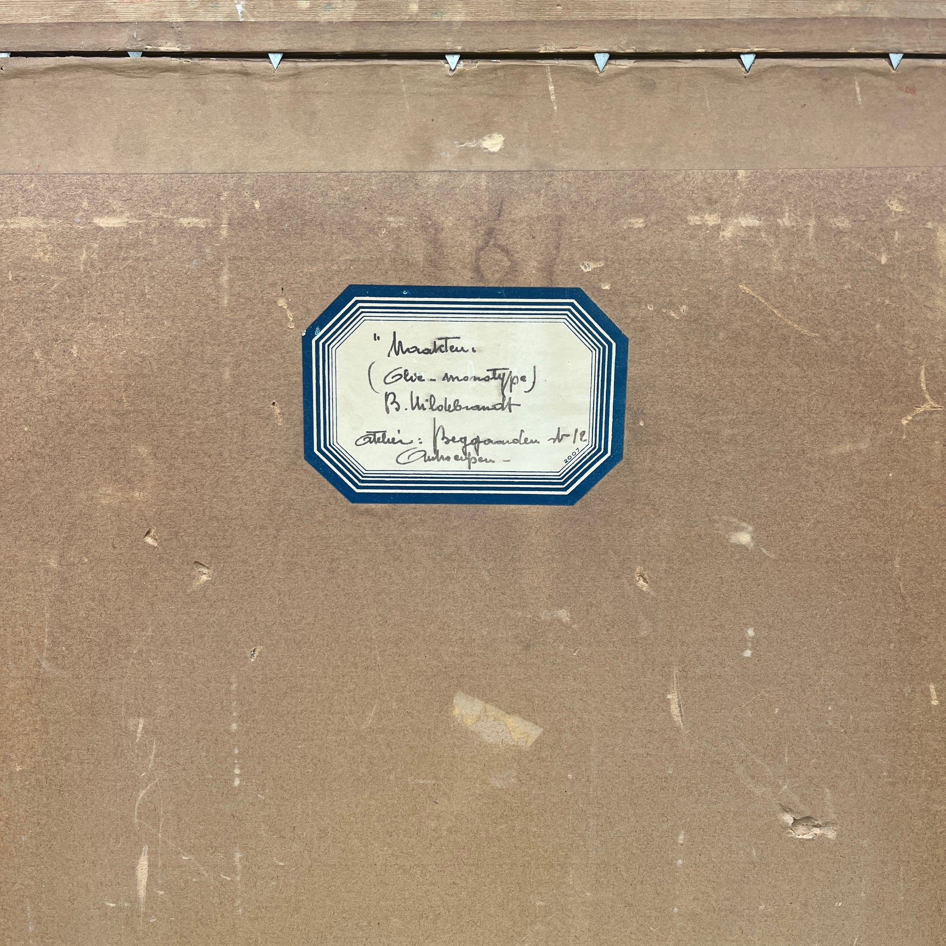 This is a large Dutch mono print which has been framed behind glass. On the back of the painting are the words (translated from the Dutch): 'Mono print, B Wildebrandt Studio: Begganden Autno, Expen 2007 - floral'.