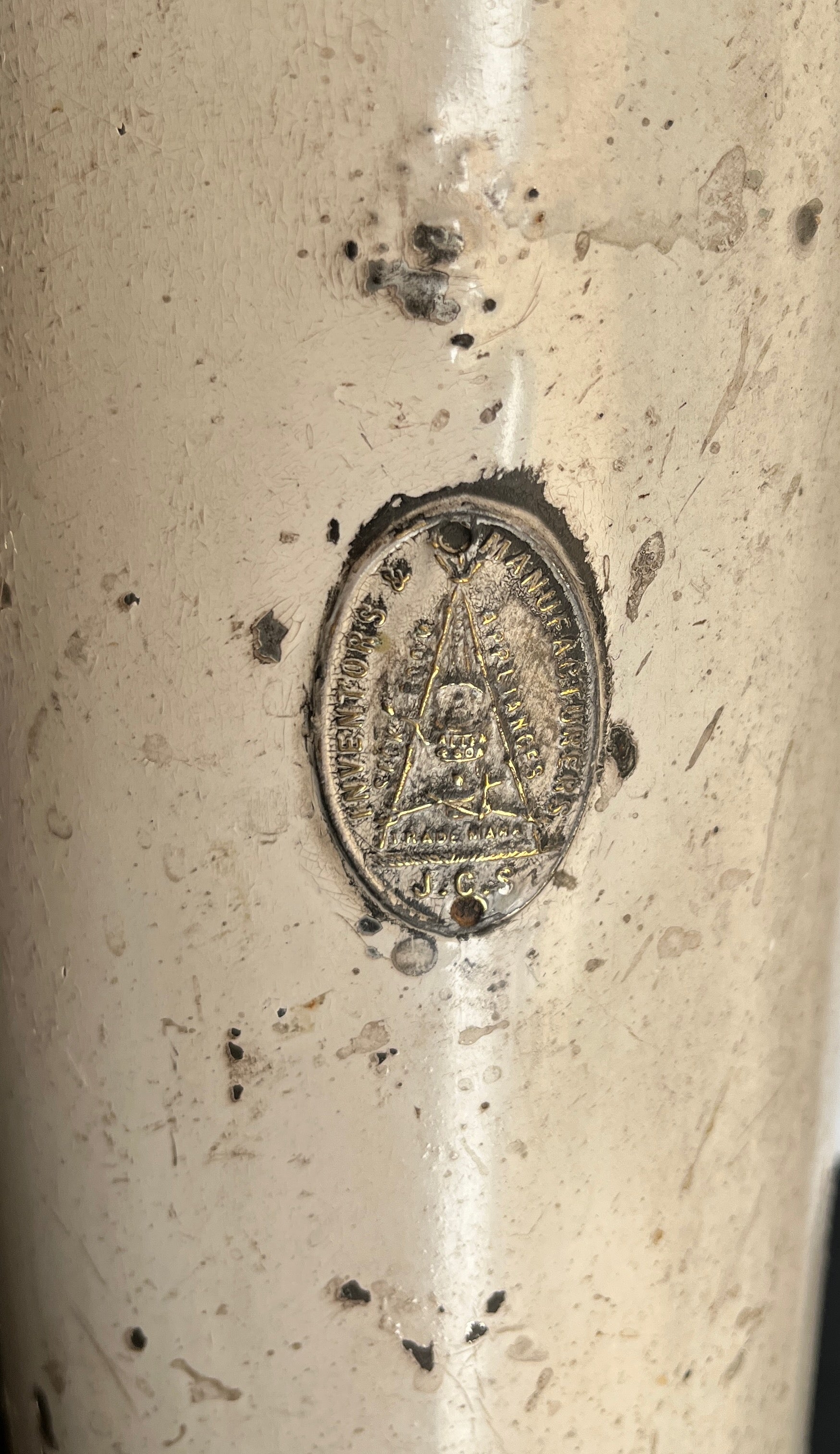 Vintage enamel irrigator which has a hinged lid and spout at the bottom. There is a hole at the top of the irrigator which enables it to be hung on the wall. On the front is a metal plaque saying: 'Inventors & Manufacturers JCS, appliances trade mark'.