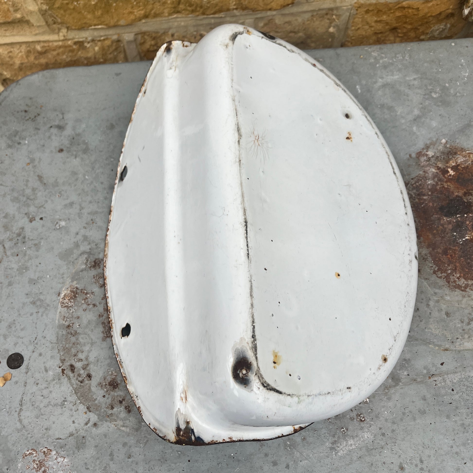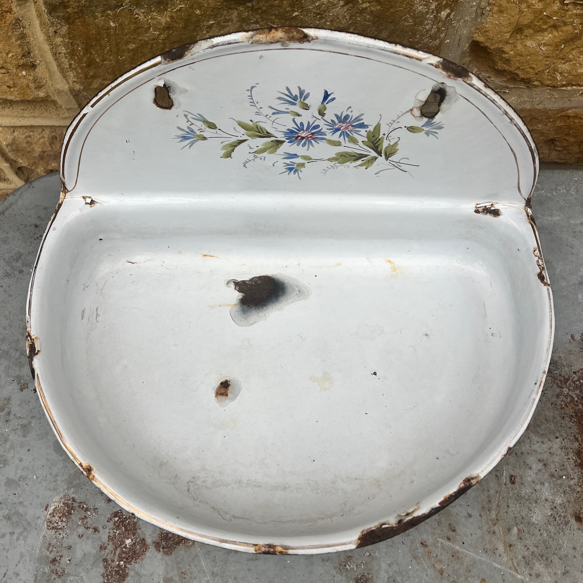 This is a very pretty vintage French Fountain Bowl which has 2 holes at the top enabling it to be attached to a wall with decorative floral patterns of blue flowers on the top and front of the bowl.