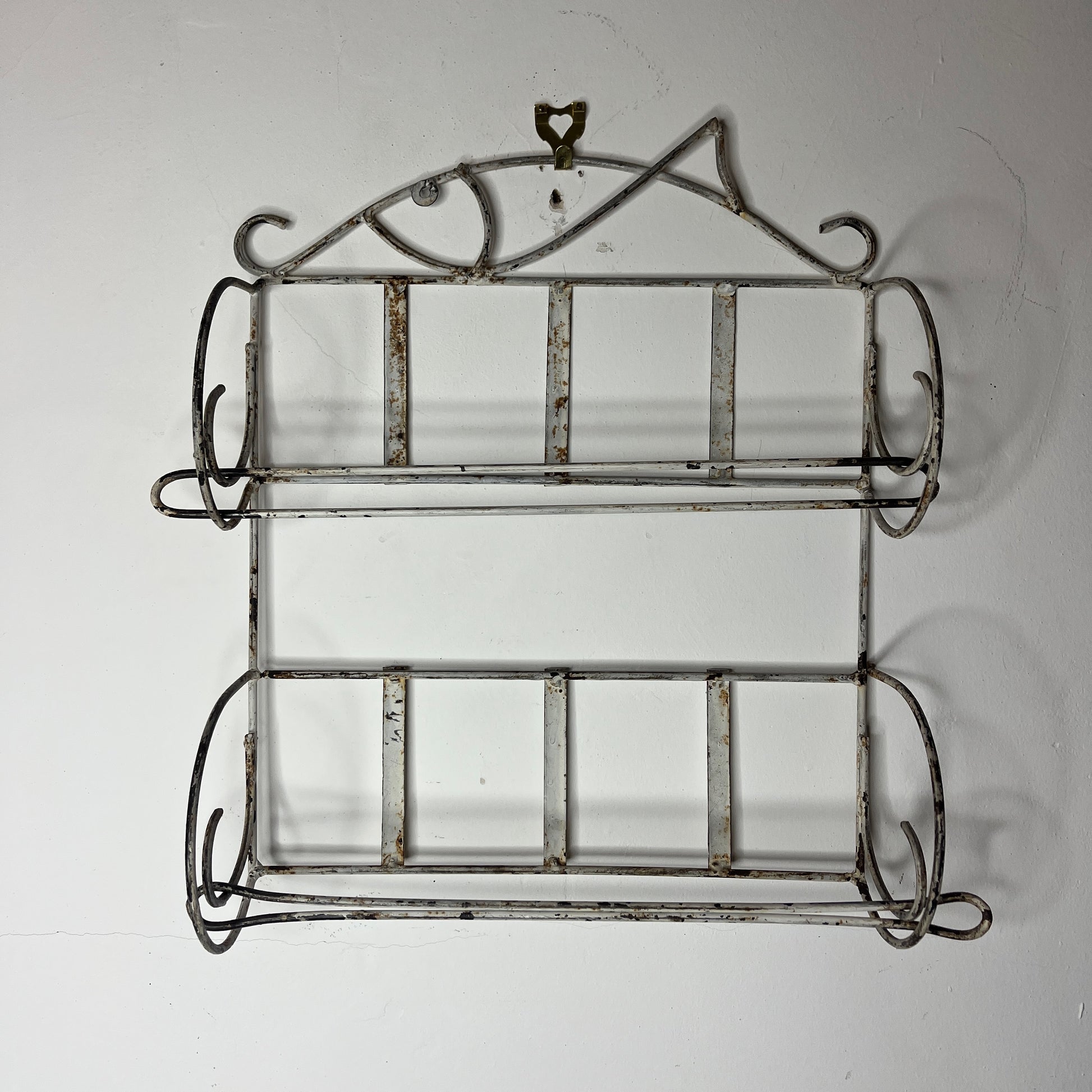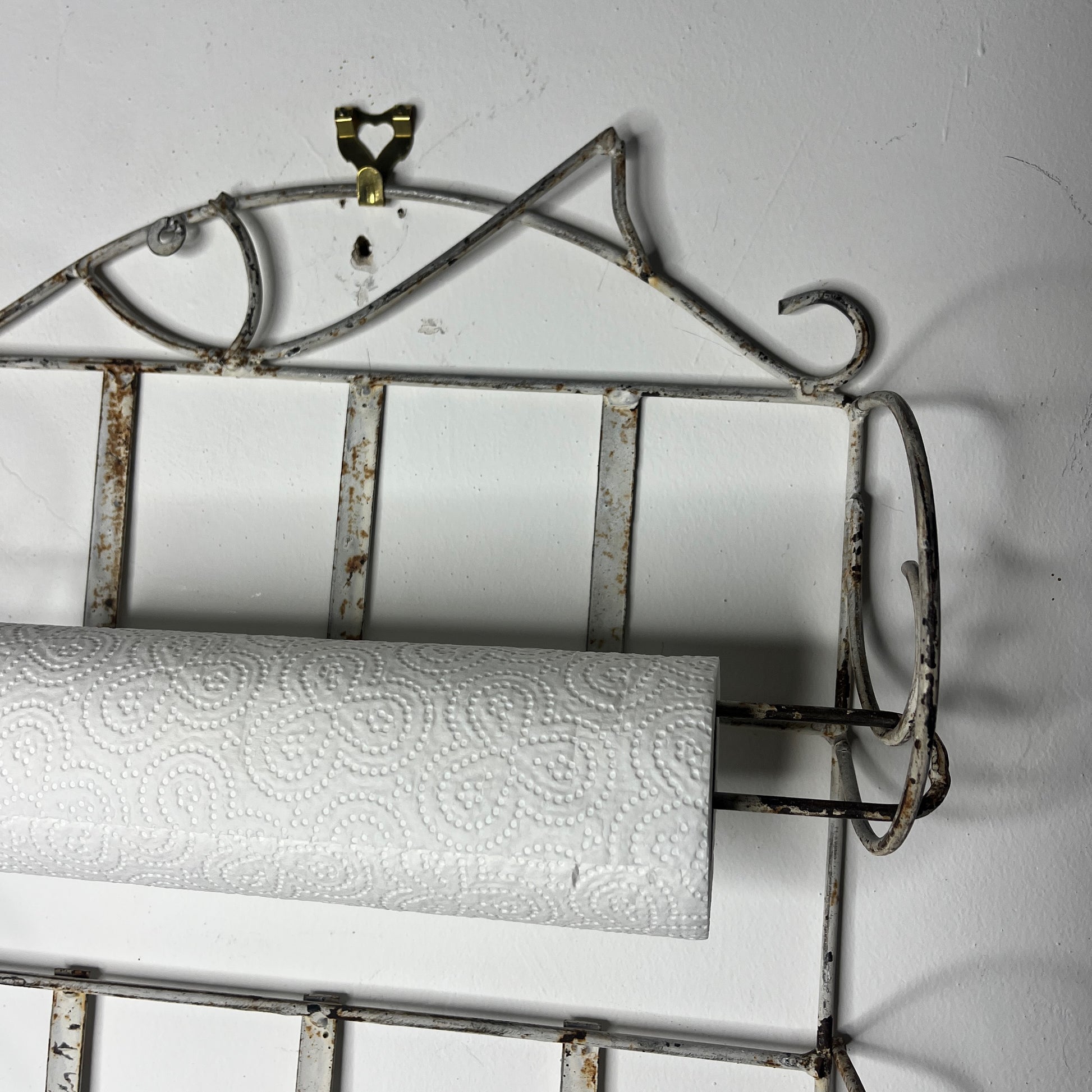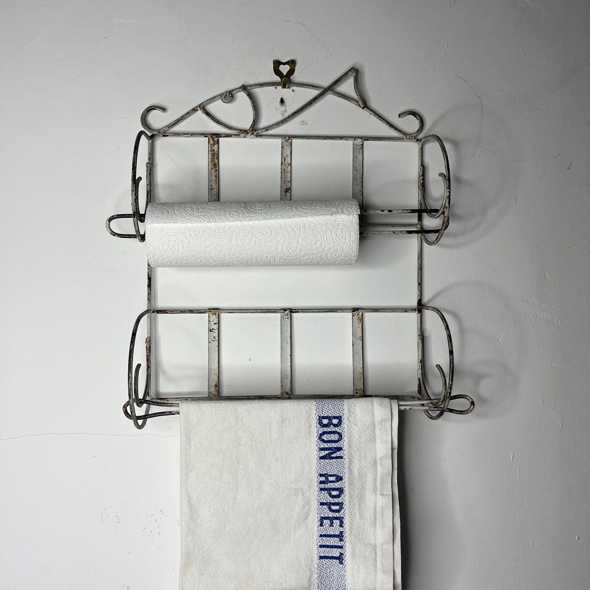 This is a really lovely vintage French decorative kitchen paper and towel rail. It is made from metal, has decorative detail and painted white. Because its vintage some of the paint has chipped off adding to its vintage charm.
