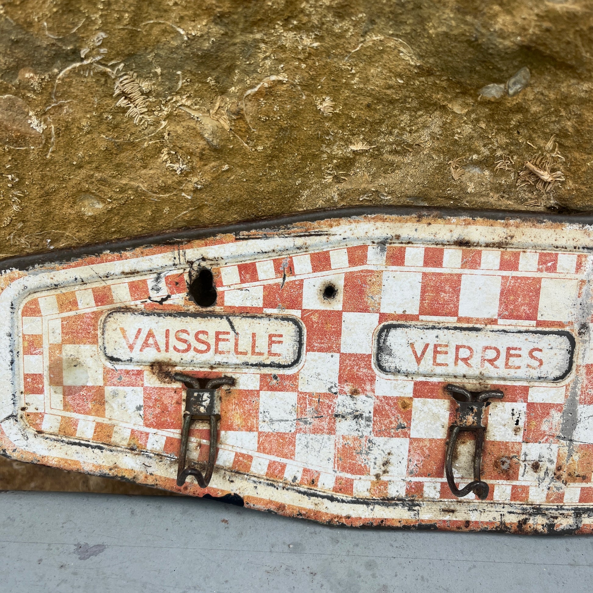This is so French. It is a vintage Torchon Rack for tea towels. It is made from metal, has a pink and white chequer board pattern and 4 hooks with the following written above them: