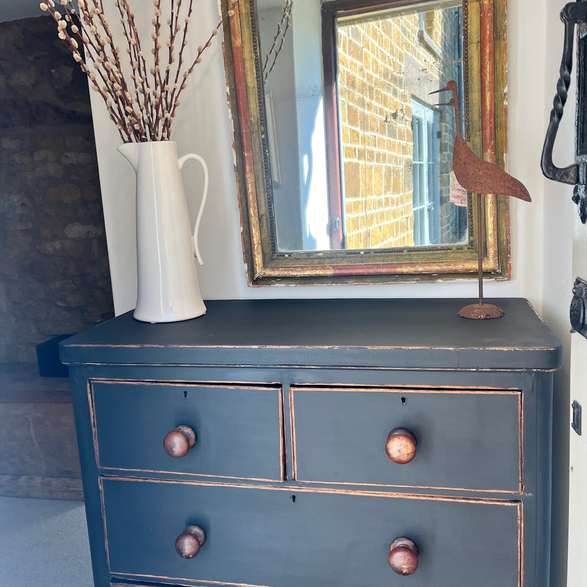 This is a very attractive vintage pine chest of drawers which has been painted black and distressed. It has two drawers over three larger drawers and pine knobs. It has been painted and waxed.