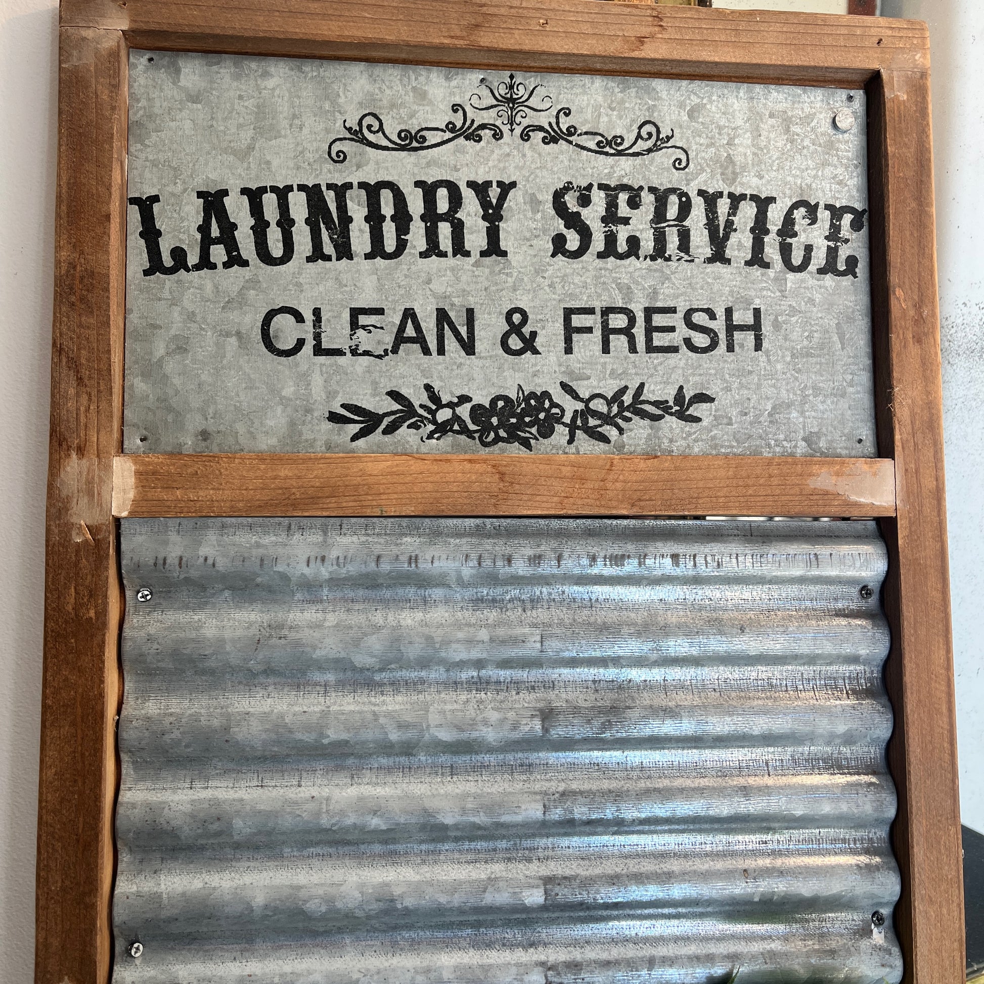Decorative washboard with stencilled detail at the top saying: 'Laundry Service, Clean & Fresh', a shelf nera the bottom and two knobs at the bottom which can be used as hooks.
